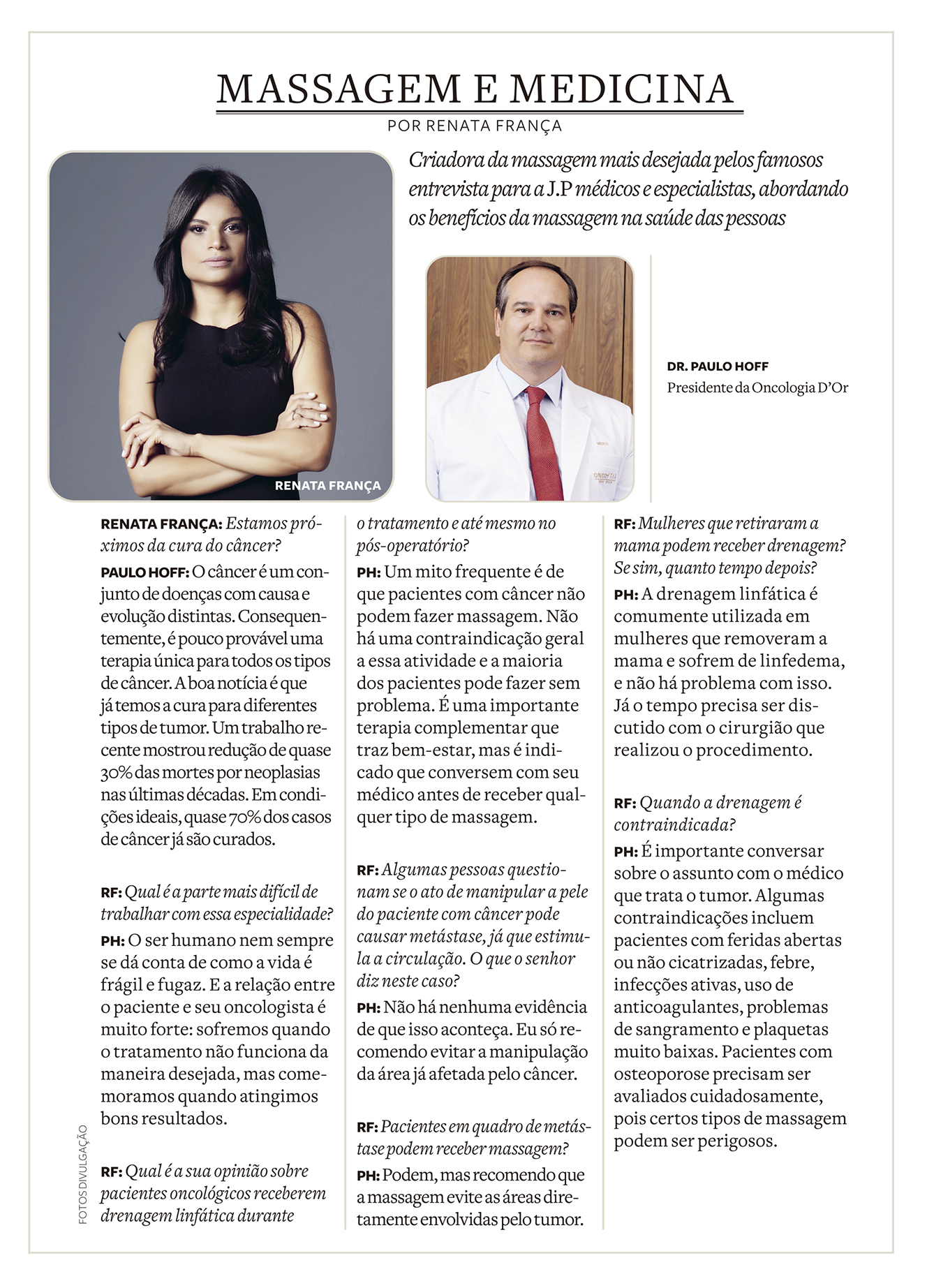 Criadora da massagem mais desejada pelos famosos entrevista para a J.P médicos e especialistas, abordando os benefícios da massagem na saúde das pessoas